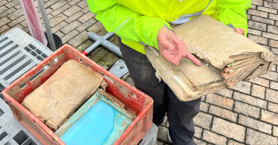 An den einzelnen Stationen wurde das Vorgehen ausführlich erklärt und im Anschluss fleißig geübt. Bei der Bergung war überraschend, wie schwer und gleichzeitig weich durchnässtes Archivgut ist. Nur wenige Objekte konnten in die bereitgestellten Kisten gepackt werden, damit diese vom Logistikteam noch bewegt und mit Sackkarren zur Erstversorgung gefahren werden konnten. Dort wurden die einzelnen Objekte mit Wasser vorsichtig abgespült, um die ersten groben Verunreinigungen zu entfernen.