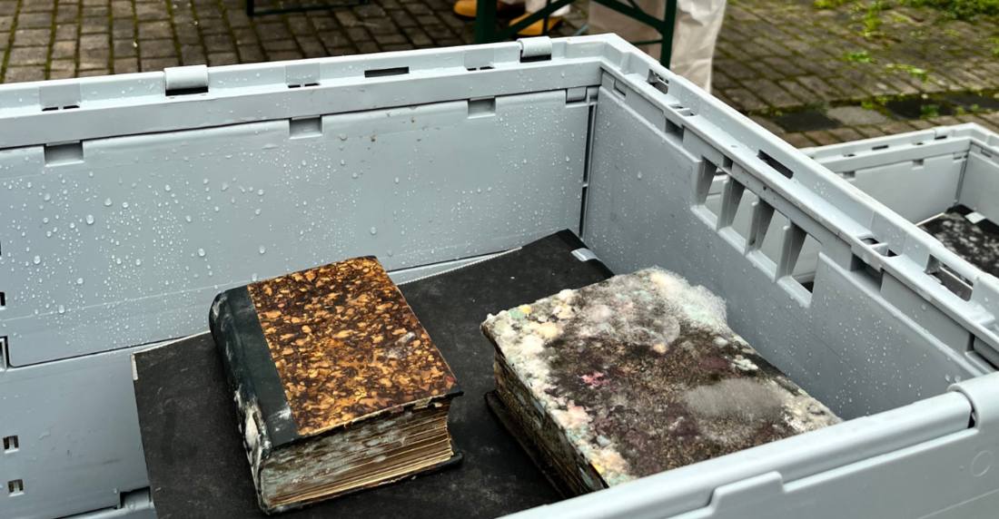 Wasser stellt für Archive und Bibliotheken mit ihren empfindlichen Beständen aus Papier die größte Bedrohung dar – und die wahrscheinlichste, da ein defektes Rohr genauso wie ein durch den Klimawandel ausgelöster Starkregen zum Katastrophenfall führen können. Mit der Feuchte kommt der Schimmel. Nach maximal 48 Stunden sollte die Erstversorgung abgeschlossen sein. Um hier Handlungssicherheit zu bekommen, wurde an zwei Tagen geübt.